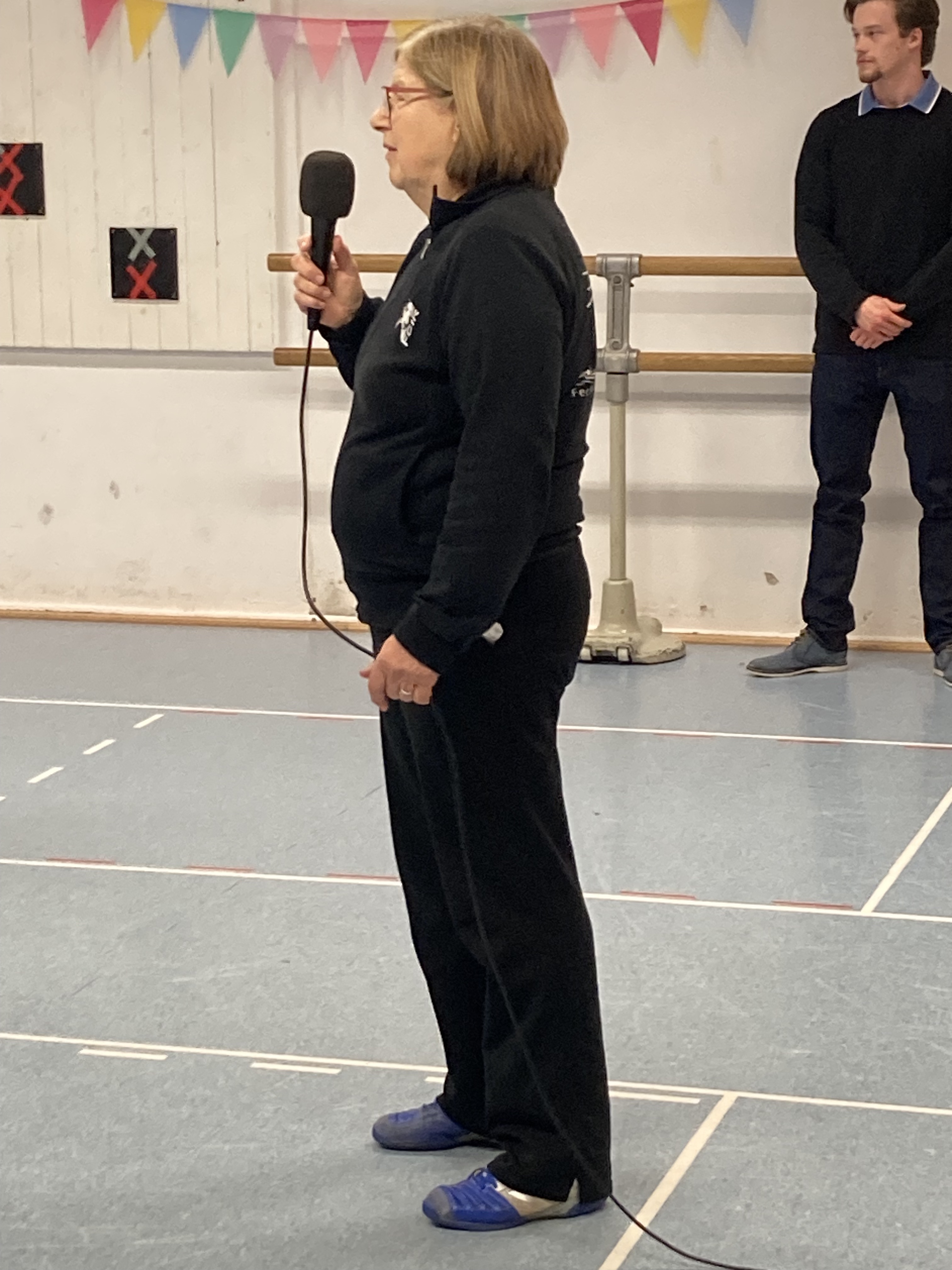 Die 2. Vorsitzende Sigrid Kiehl moderiert das Schaugefecht und erläutert den Gästen die Fechtaktionen.